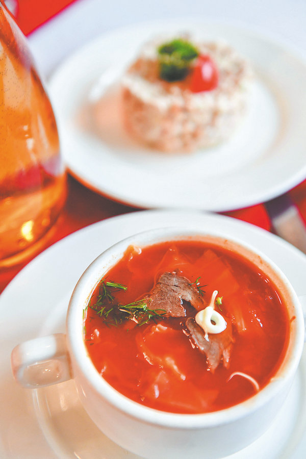Borscht is a classic appetizer in Russian cuisine, made primarily with beets and complemented by ingredients like beef, potatoes, onions and carrots, simmered for a long time to create a rich, tangy and hearty soup.