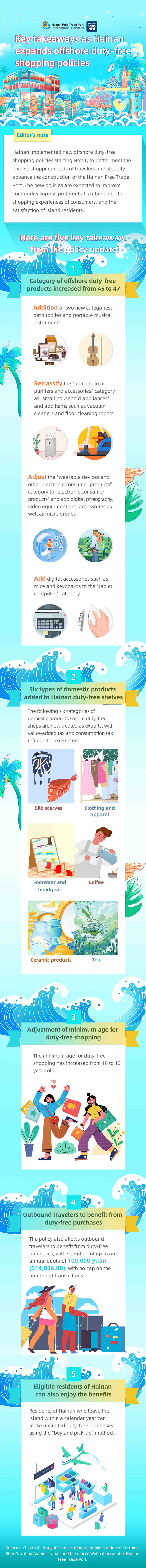 Hainan implemented new offshore duty-free shopping policies starting Nov 1, to better meet the diverse shopping needs of travelers and steadily advance the construction of the Hainan Free Trade Port. The new policies are expected to improve commodity supply, preferential tax benefits, the shopping experiences of consumers, and the satisfaction of island residents.