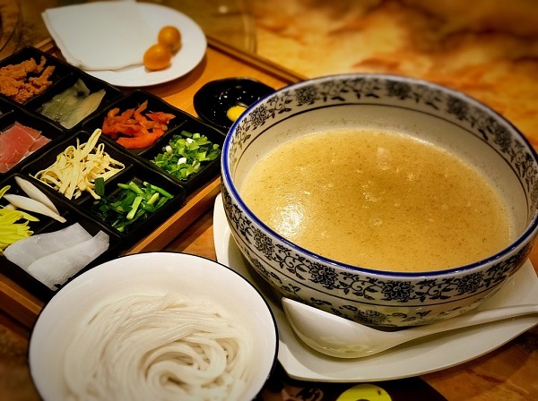 The dish is a rice noodle soup mixed with pork, chicken and vegetables. Visitors can eat authentic crossing-the-bridge noodles in many chain restaurants in Kunming, such as Qiaoxiangyuan (桥香园) and Jianxinyuan (建新园).