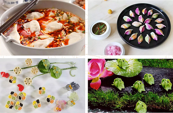 From left to right, top to bottom: Dumplings with sour soup, dumplings colored with vegetable juice, hetang yuese (an assorted dish decorated with frog-shaped dumplings and lotus root snacks), and yuese waming ( frog-shaped dumplings).