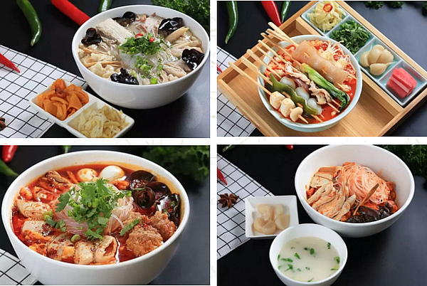 From left to right, top to bottom: hulutou paomo, hulutou paomo with chuanchuan, vegetables and meat skewers served in hot and spicy broth, traditional hulutou paomo and stir-fried hulutou paomo.